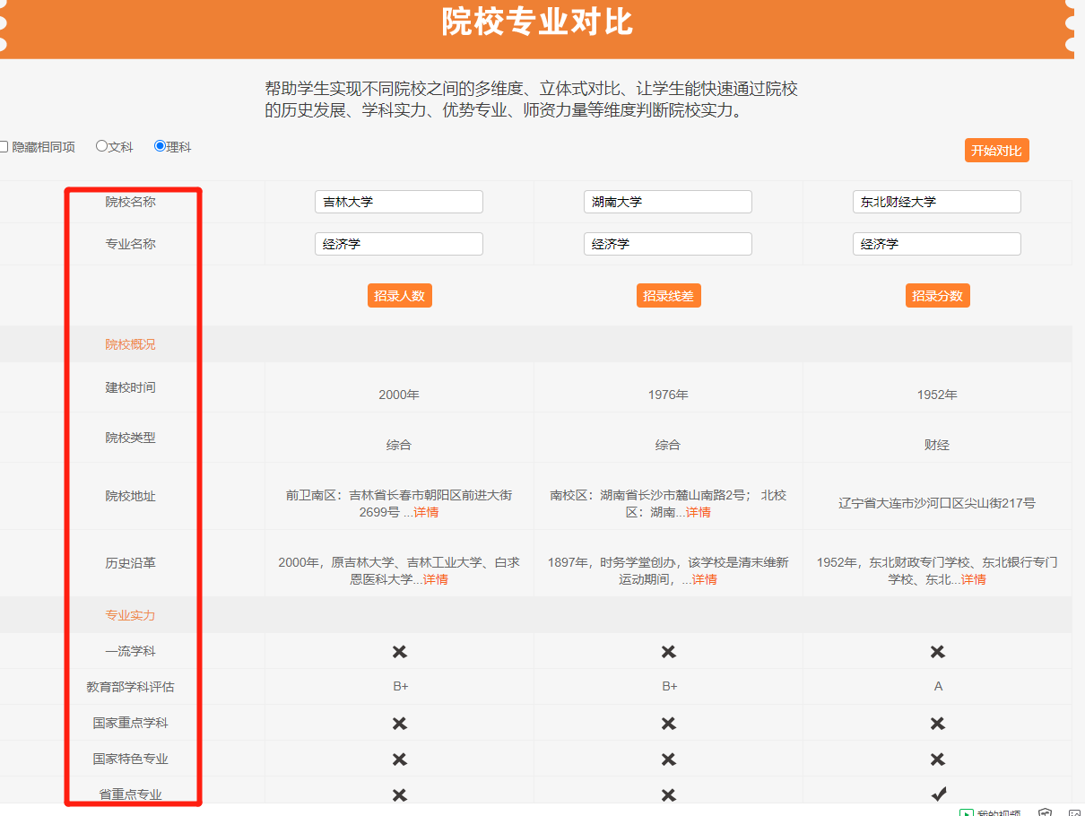 3.点击“开始对比”。进入对比页面,可直接查看所对比院校及专业在招录分数、招录人数、招录线差、专业实力、发展前景五个方面的详细对比情况。