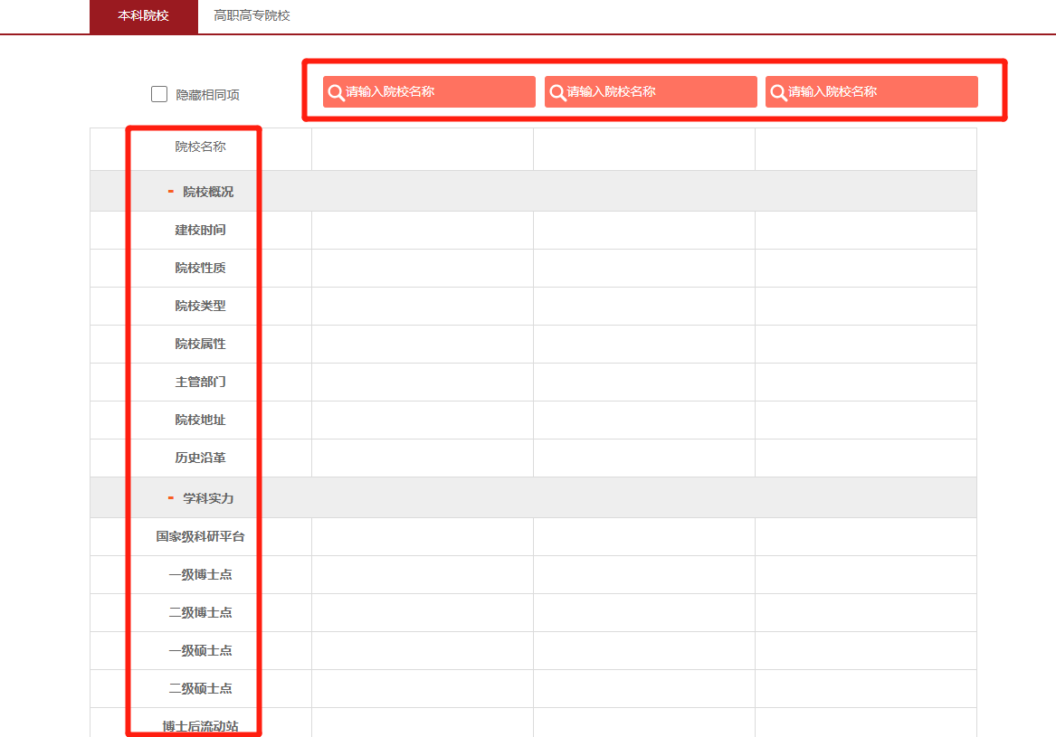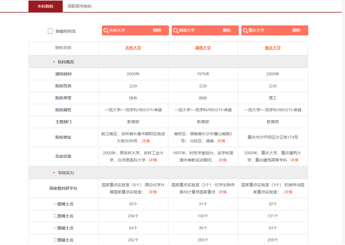 2.可根据筛选条件(所在省份、办学层次、院校属性)批量筛选院校;也可以直接在搜索栏中直接输入院校名称,单独查询到一所学校。