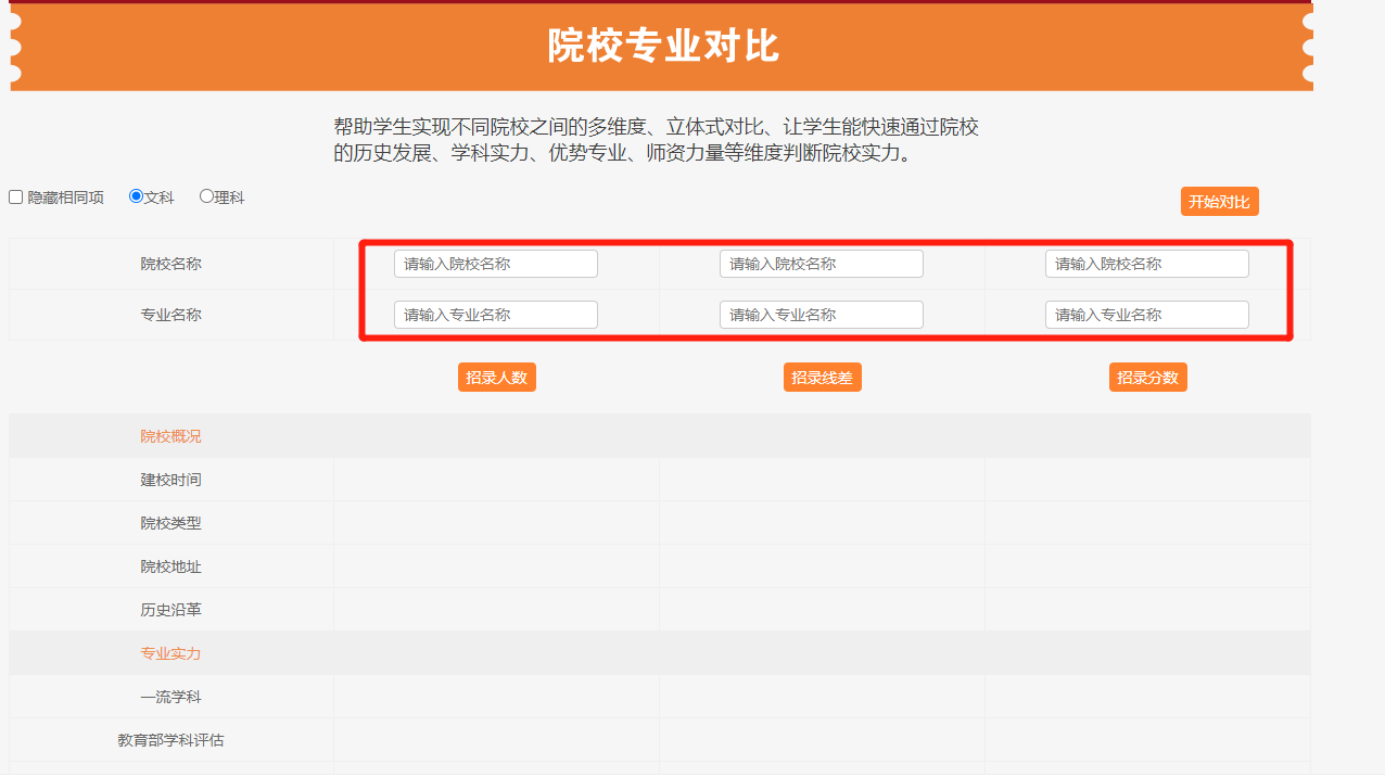 2.输入要对比院校的名称,院校对比功能可同时实现三所院校对比,对比内容包括院校概况、学科实力、优势专业、师资力量四个维度。