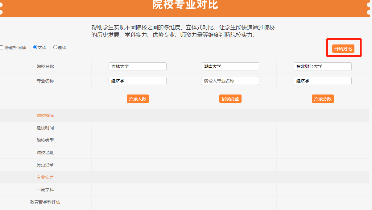 3.点击“开始对比”。进入对比页面,可直接查看所对比院校及专业在招录分数、招录人数、招录线差、专业实力、发展前景五个方面的详细对比情况。