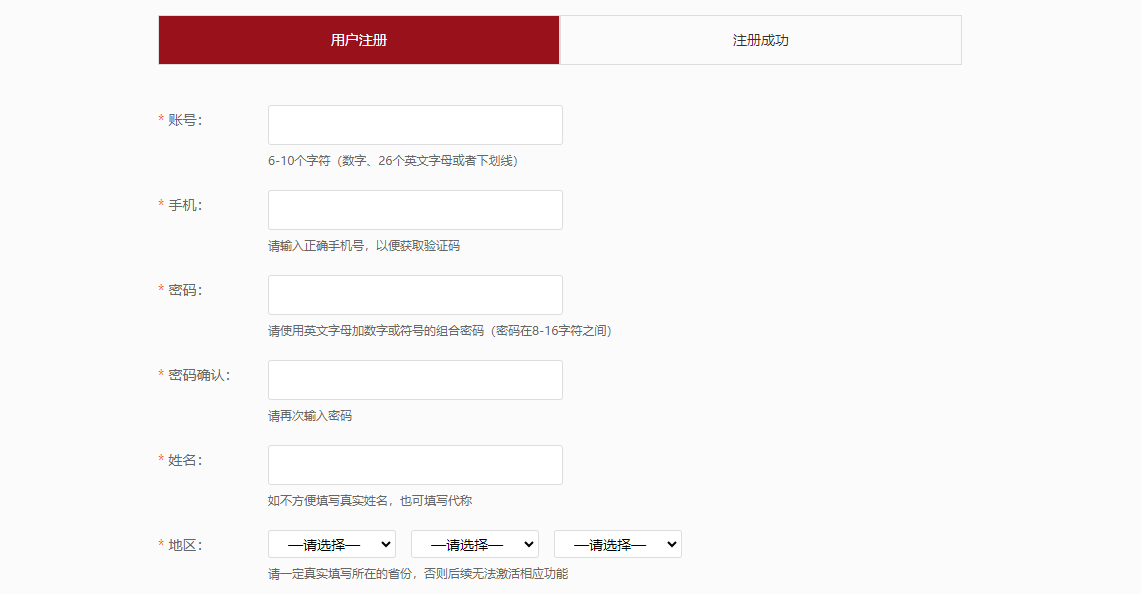 (2)跳转到用户注册页面,按照提示依次填写信息并提交,即完成注册。(注:一定要正确填写所在“地区”一项,否则无法查看到本省的数据也无法使用激活码开通相关功能。)